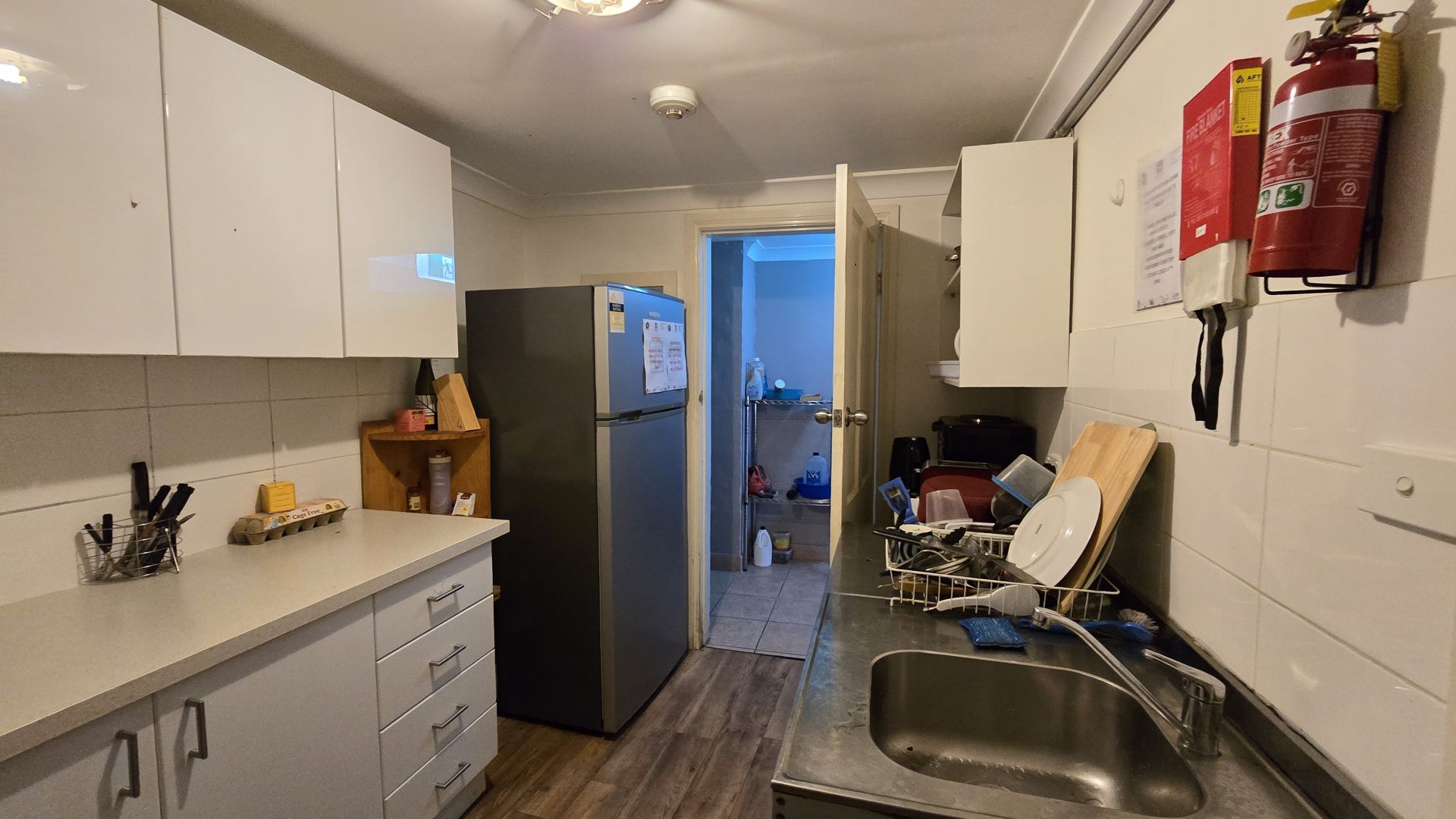 Shared laundry with coin operated washer/dryers and a common kitchen.