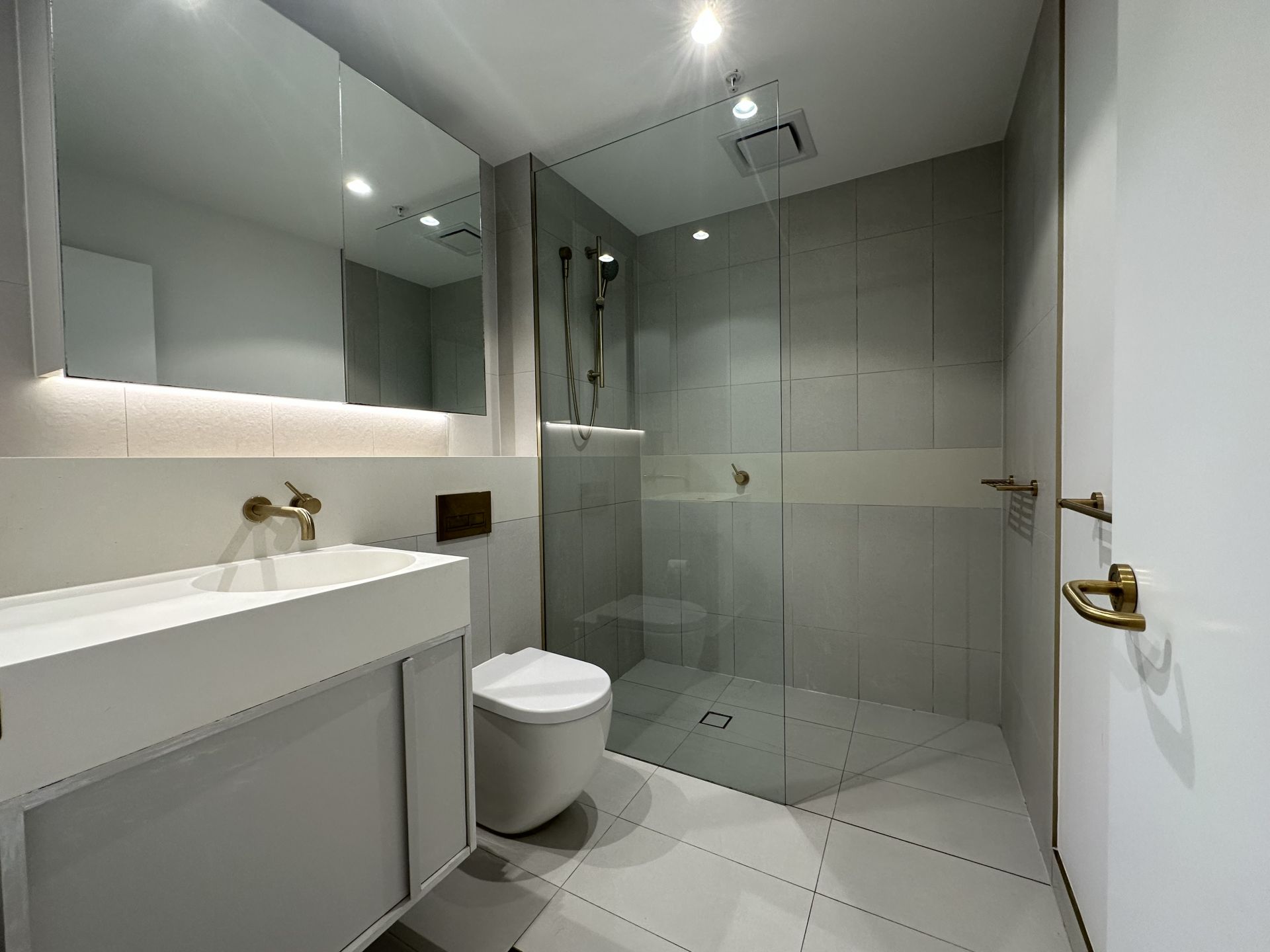 * Modern styled bathroom with expansive wall-to-wall shower