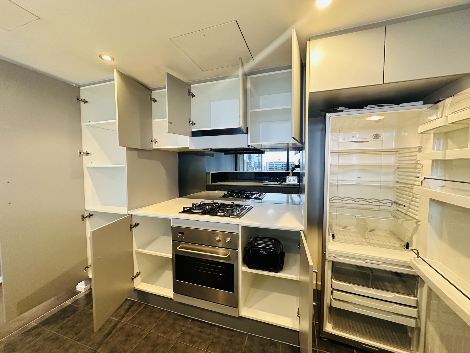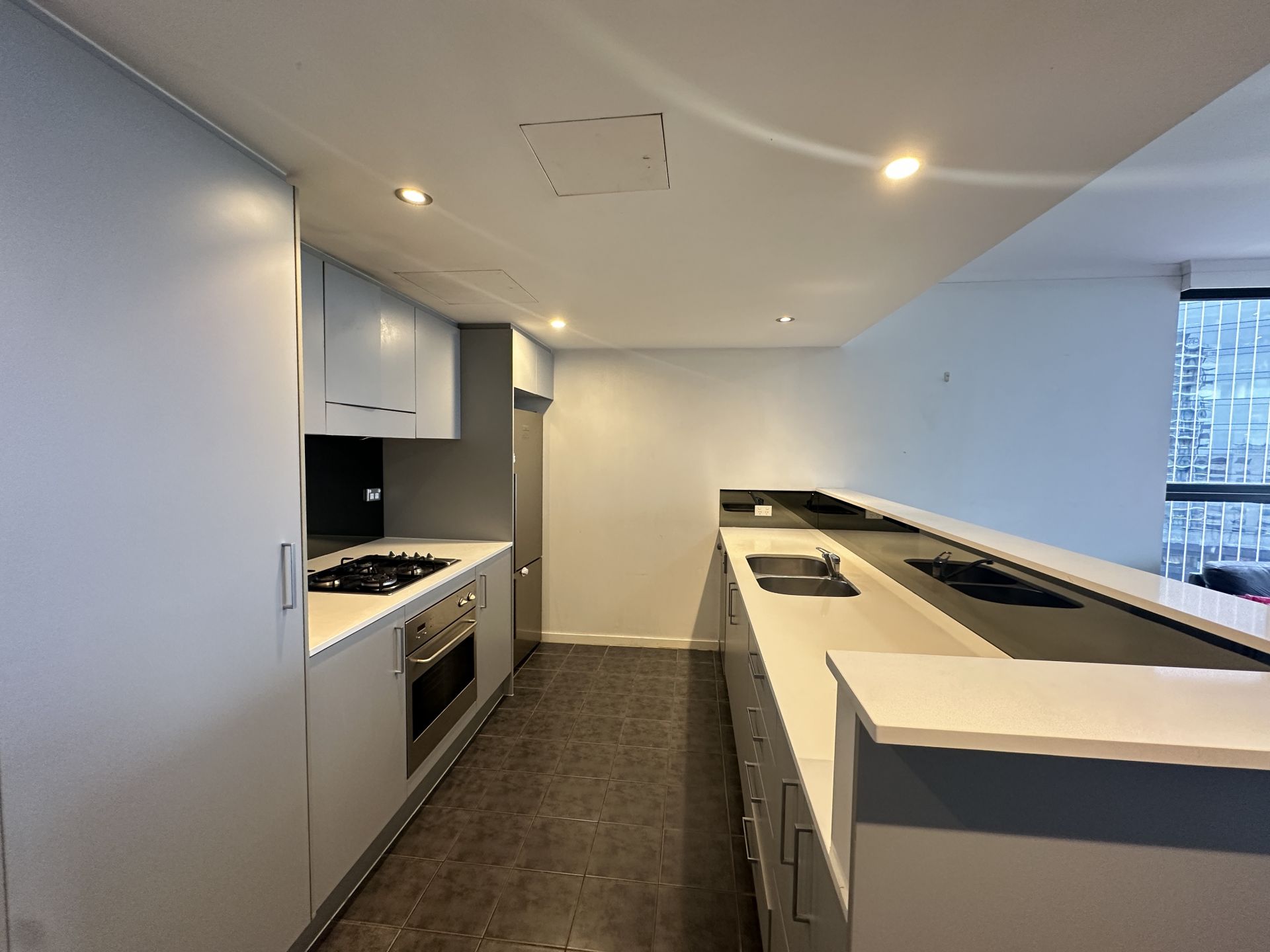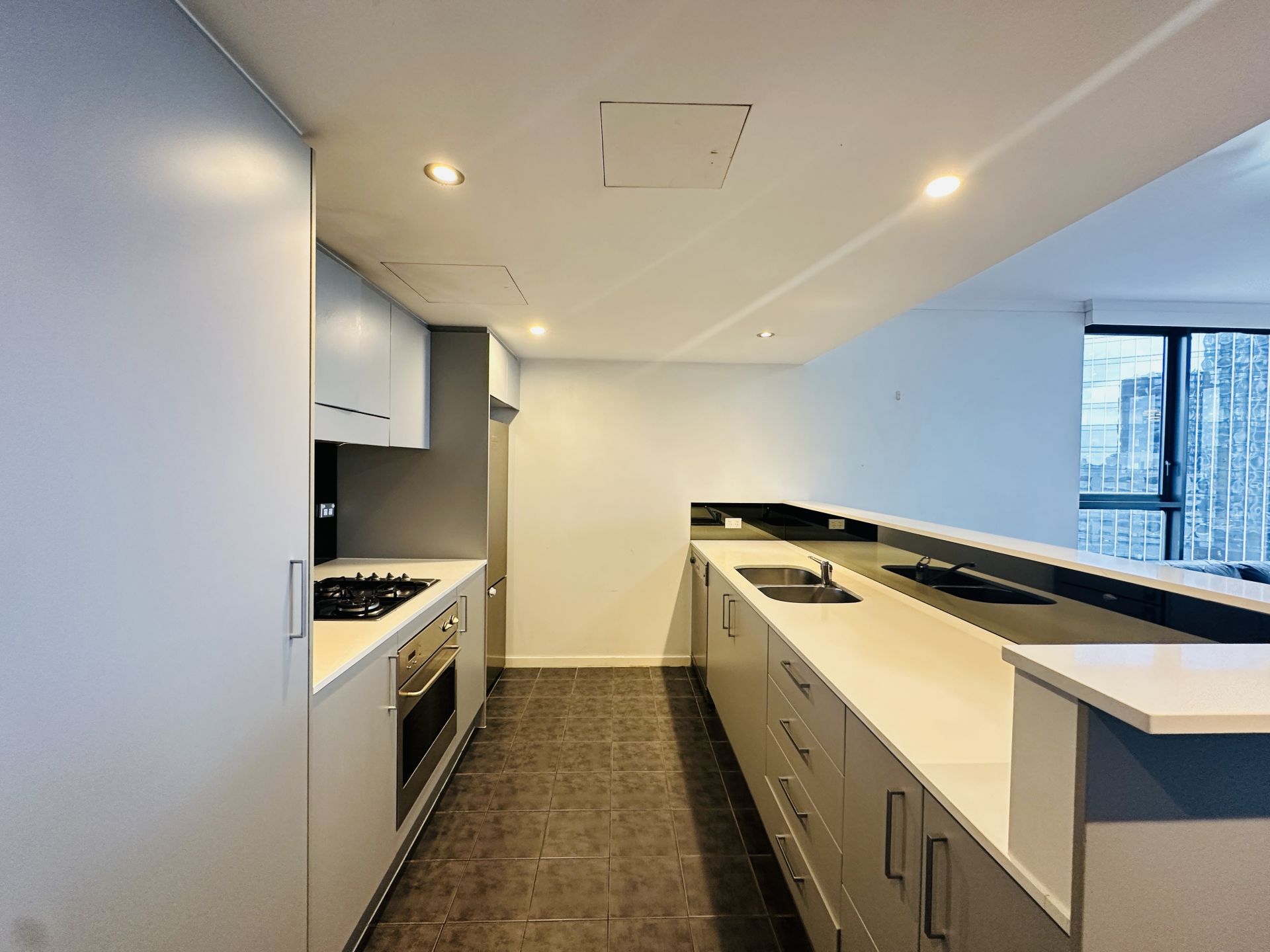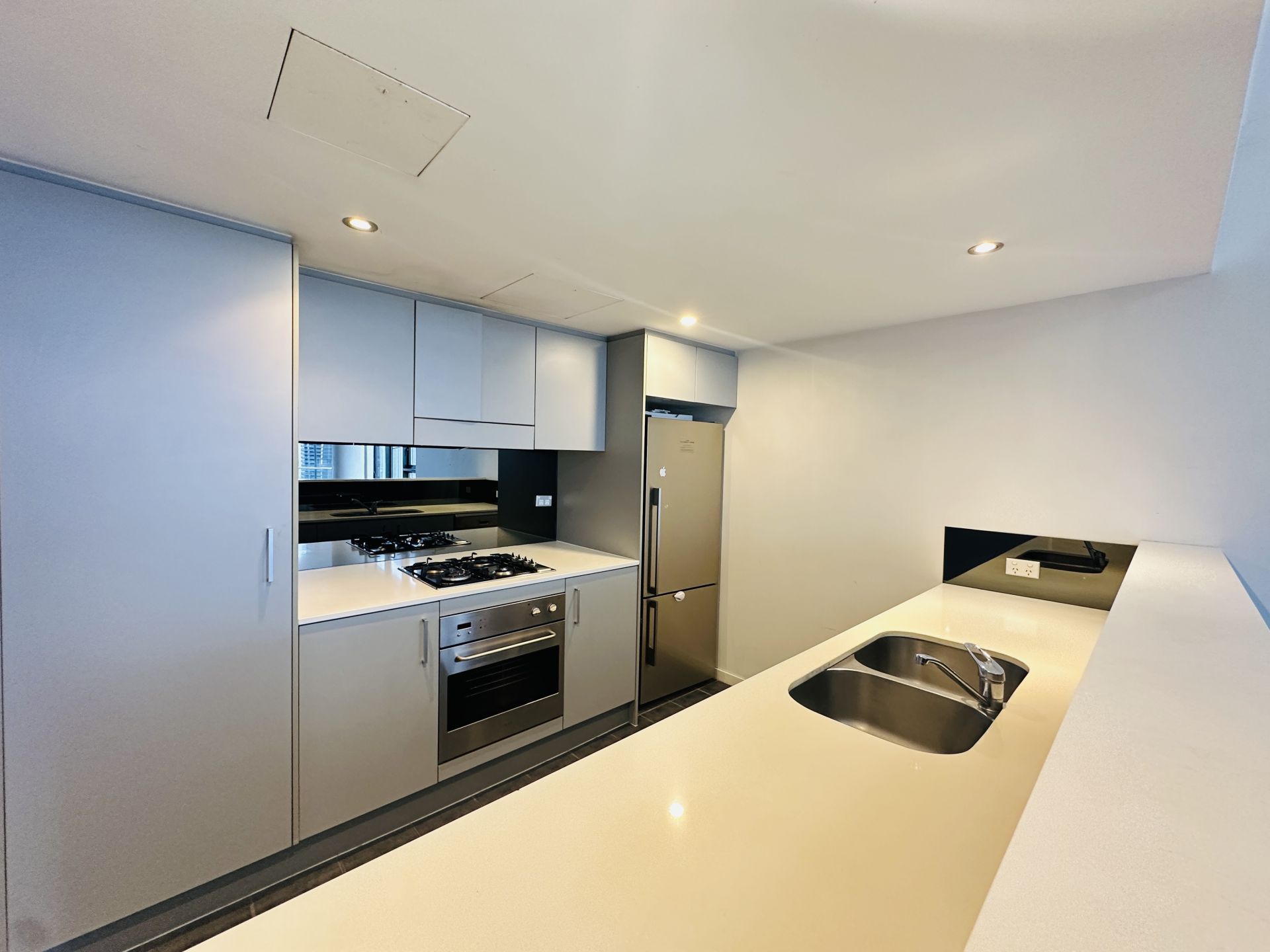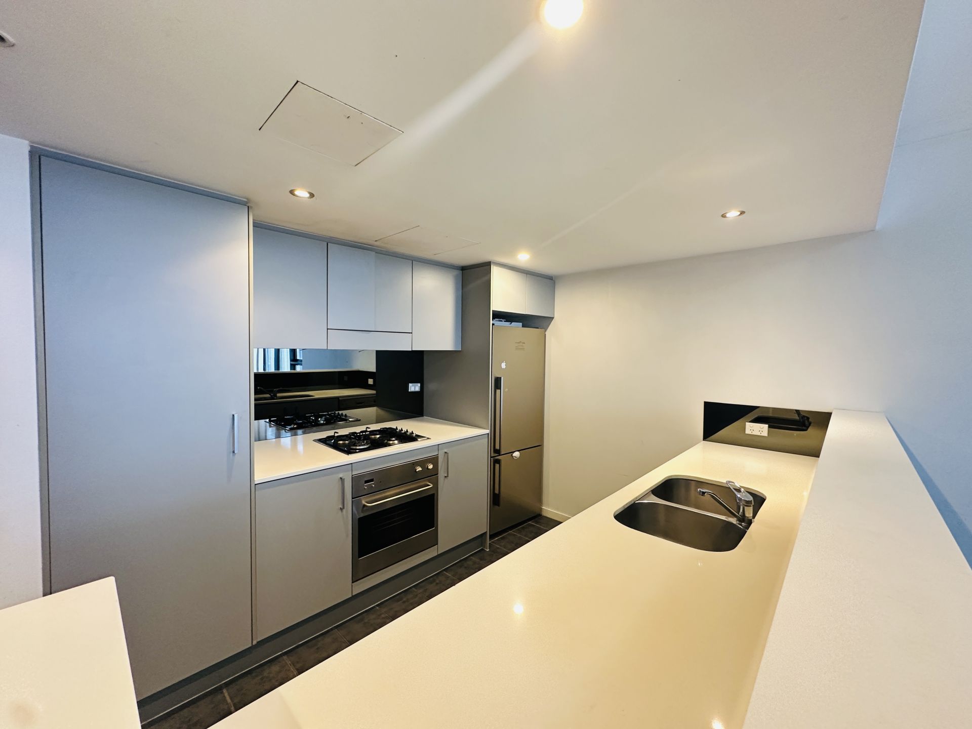 - Modern kitchen with gas cooking, stone benchtops, stainless-steel appliances, dishwasher