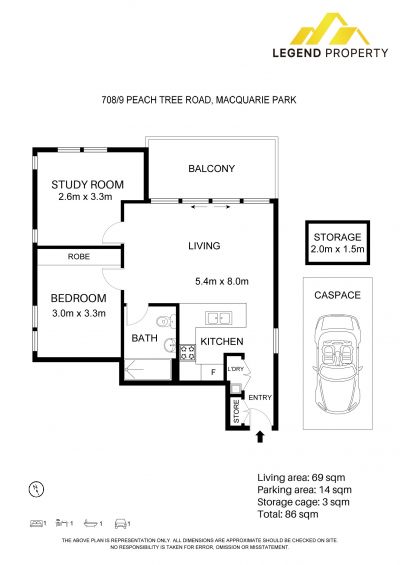 Living area 69sqm, Parking space 14sqm, Storage cage 3sqm, Total 86sqm.